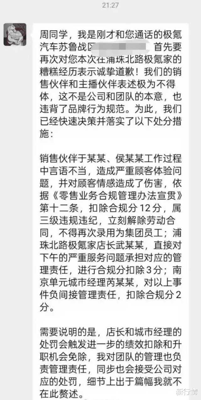 之后,有极氪区域负责人联系到该顾客,表达了歉意,并称已落实处分措施。