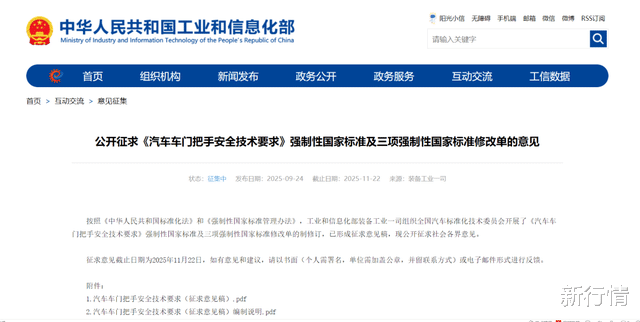 2025年9月24日,工业和信息化部装备工业一司就《汽车车门把手安全技术要求》强制性国家标准公开征求意见。征求意见稿明确规定,每个车门应配置具备机械释放功能的车门外把手。