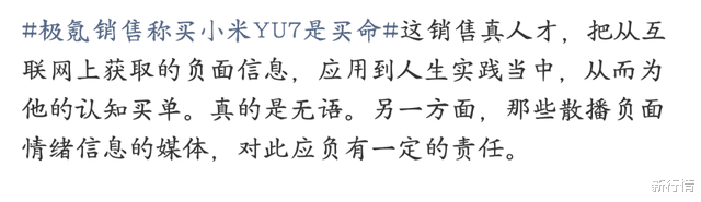 有的网友表示,“这销售真人才,把从互联网上获取的负面信息,应用到人生实践当中,从而为他的认知买单。真的是无语。另一方面,那些散播负面情绪信息的媒体,对此应负有一定的责任。”