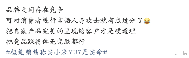 也有的网友表示,“品牌之间存在竞争,可对消费者进行言语人身攻击就有点过分了,把自家产品完美的呈现给客户才是硬道理,把竞品踩得体无完肤都行。”