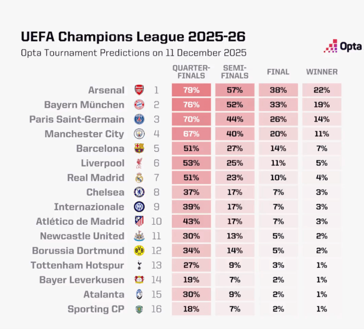 opta本赛季欧冠夺冠概率: